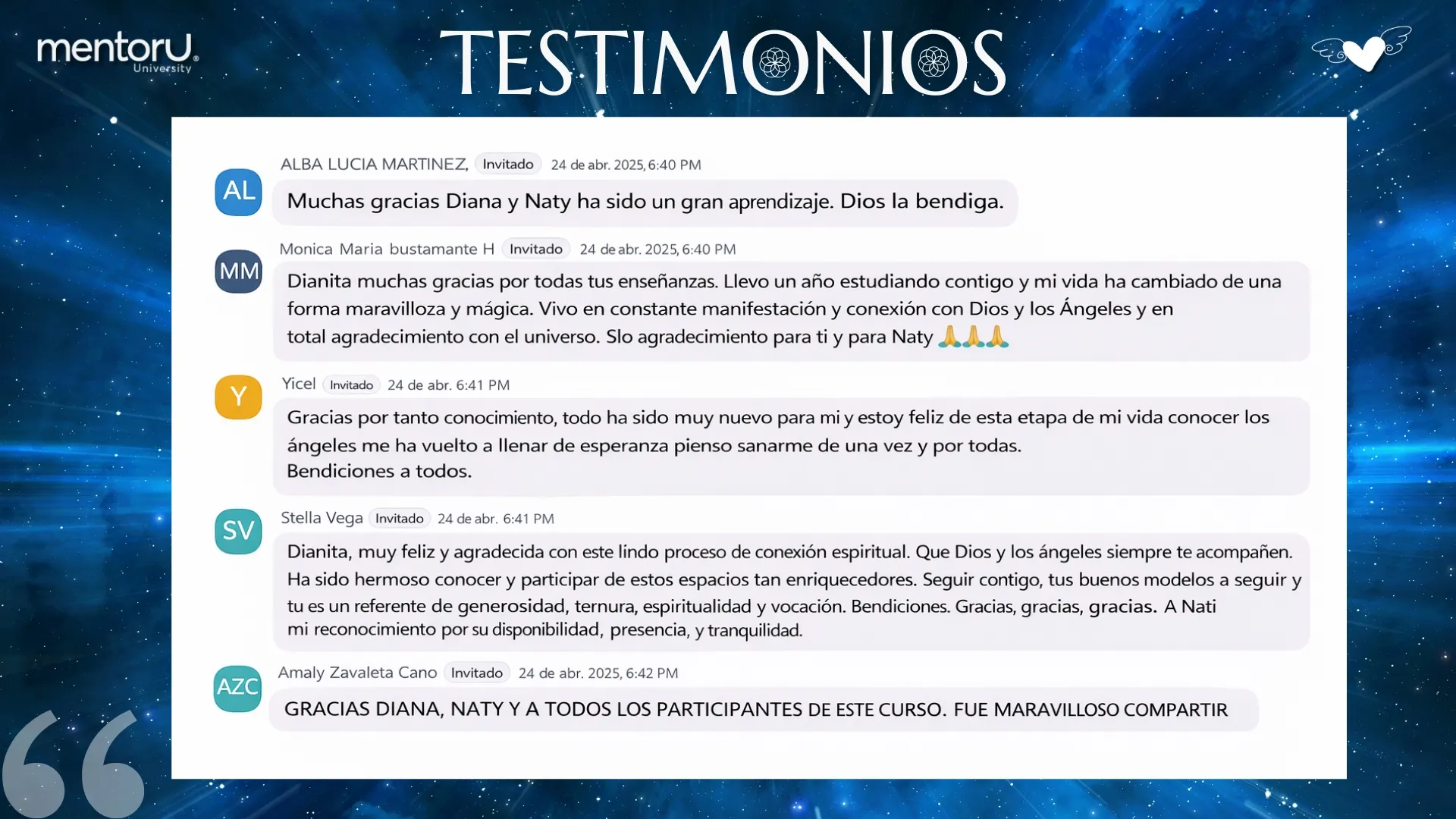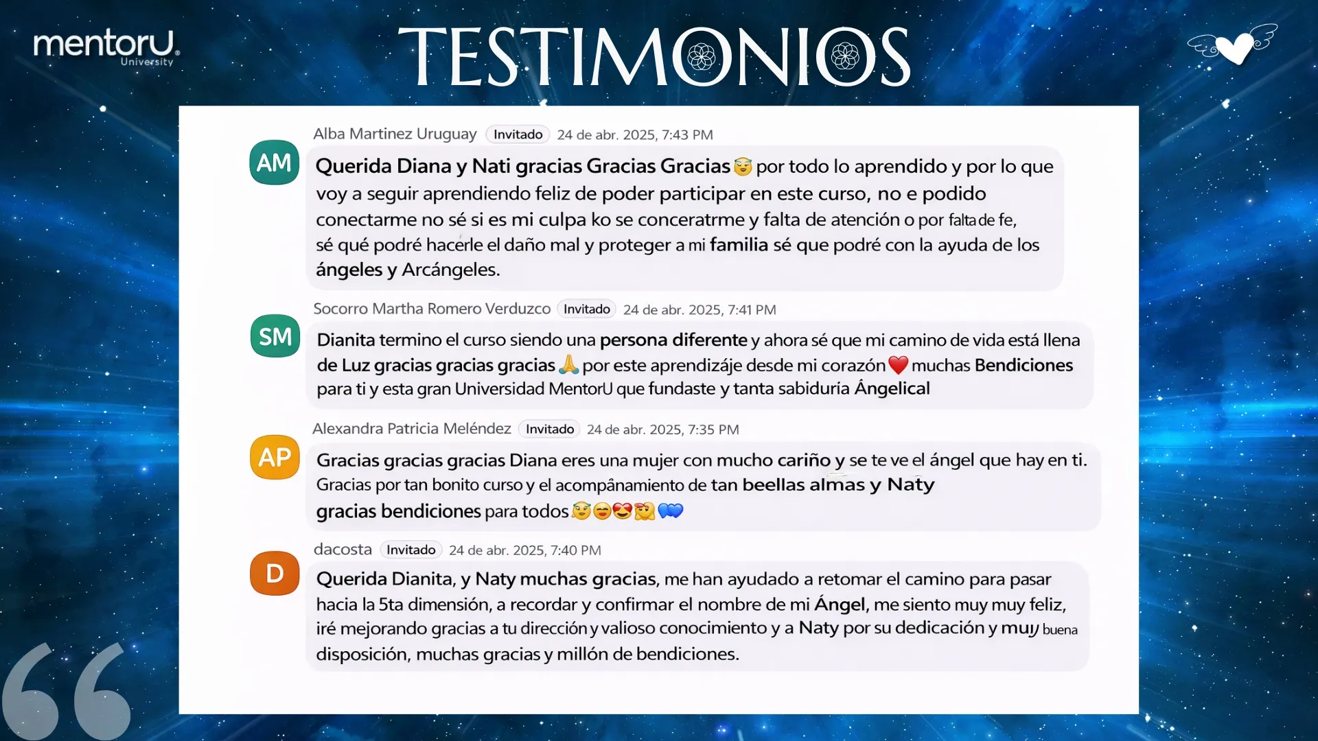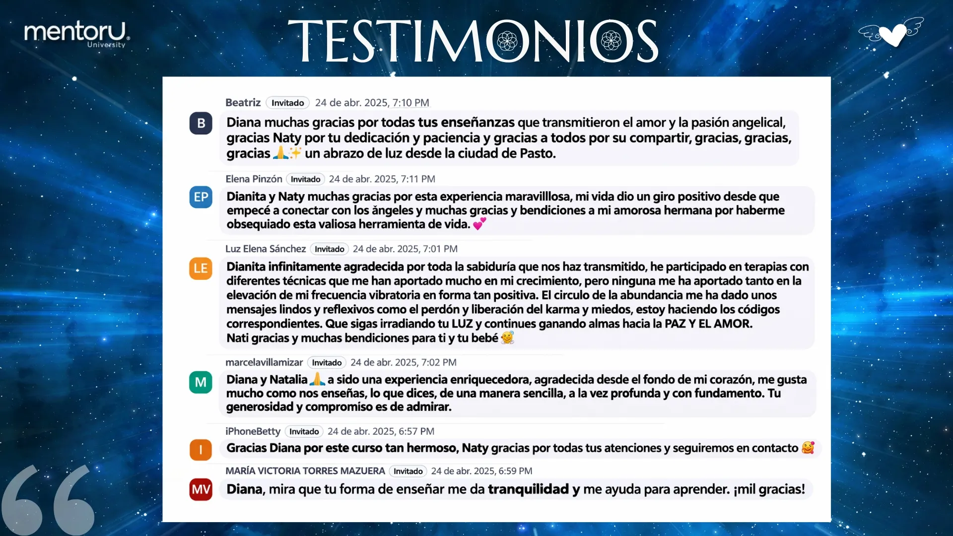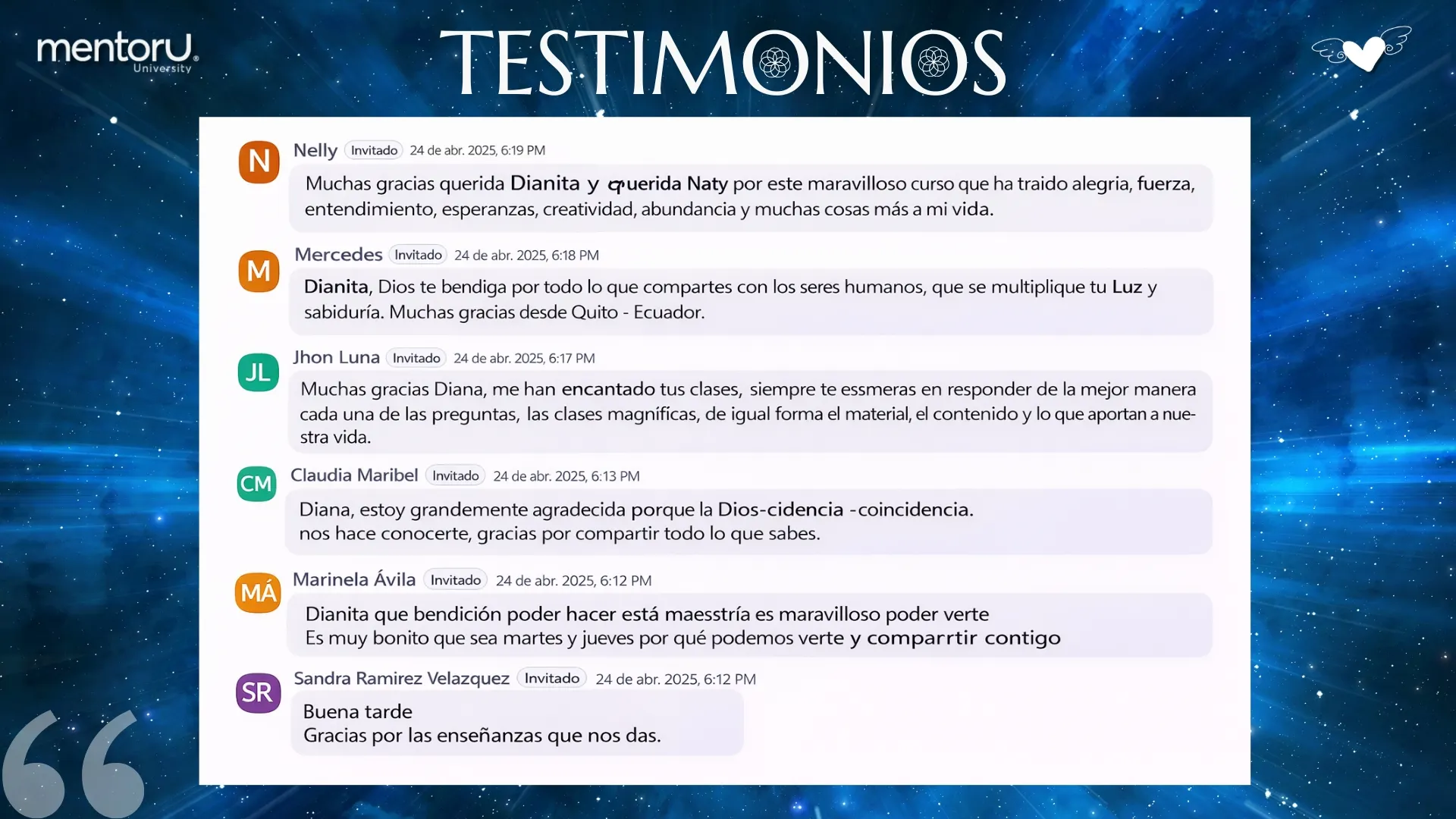 “Diana y su equipo me han llevado de la mano a conocer a los representantes de esta sutil energía de amor, para mantenernos en la más alta frecuencia de luz. Más que hacer la maestría, la invitación es a vivirla, semana a semana, logrando así una conexión genuina y única con nuestro ángel de la guarda y con todos los demás seres de la corte angelical que están a nuestro servicio. Estoy muy agradecida por haber tomado acción y haberme dado la oportunidad de inscribirme a la Maestría”.