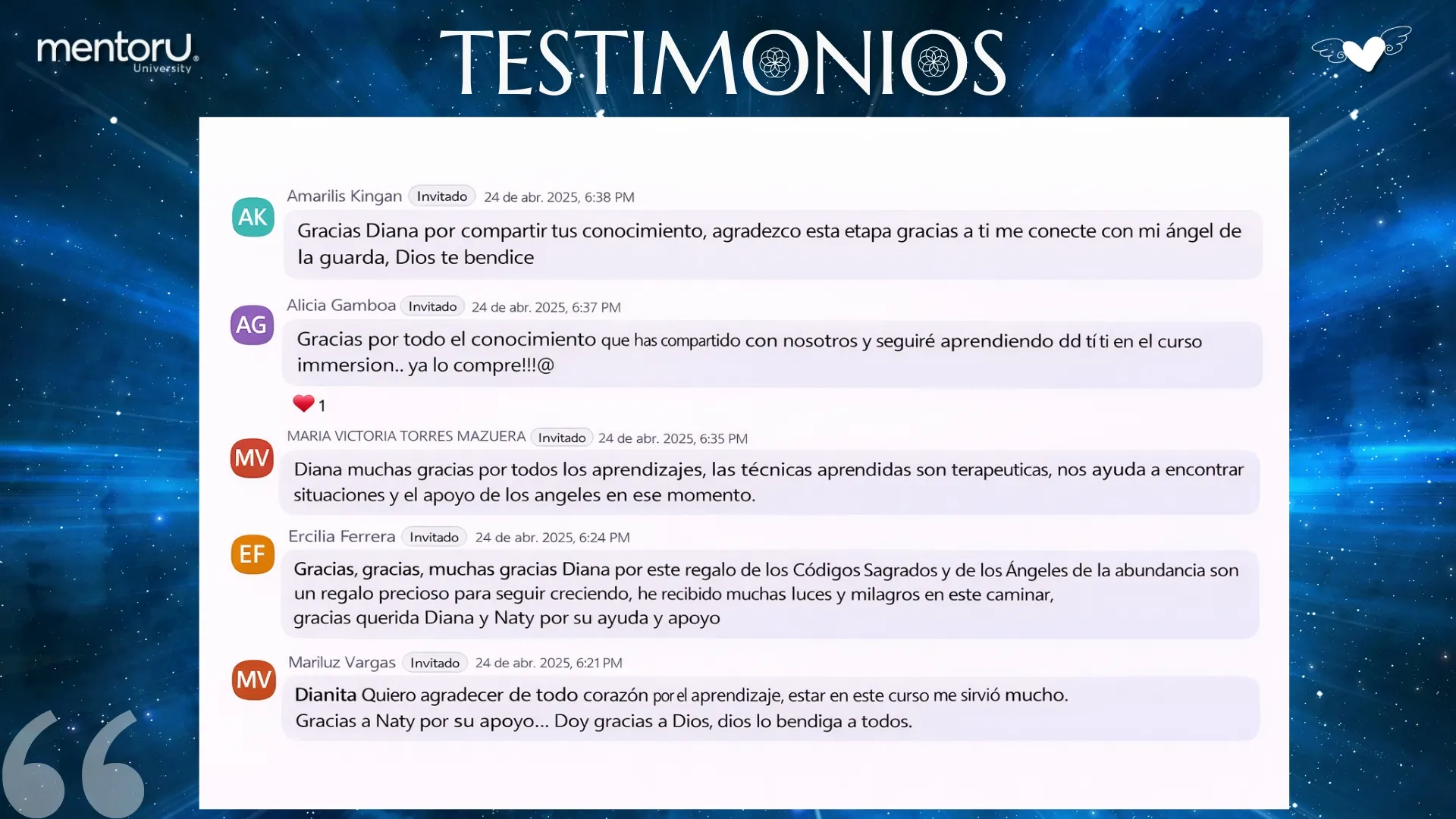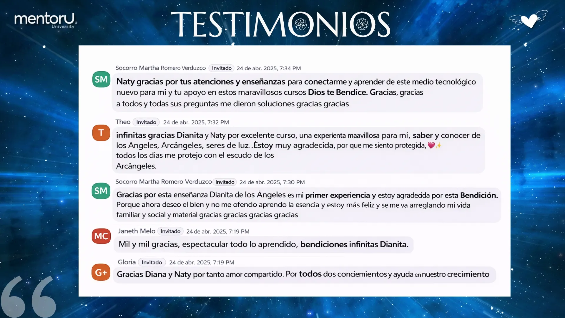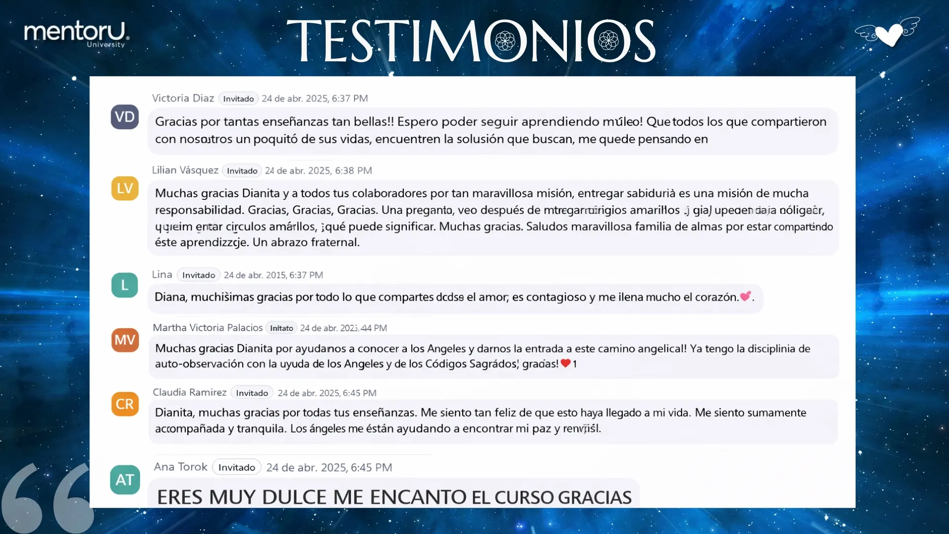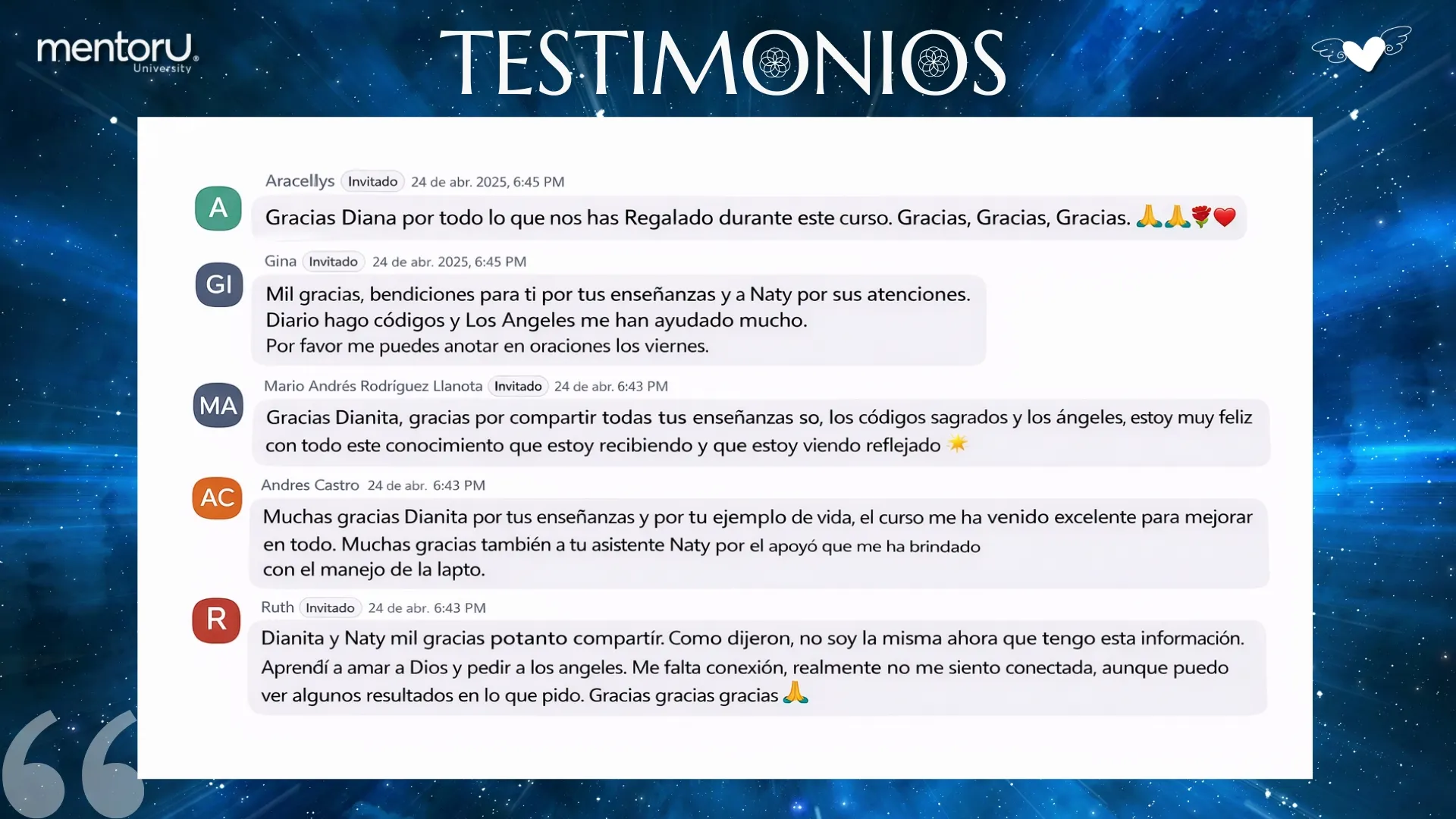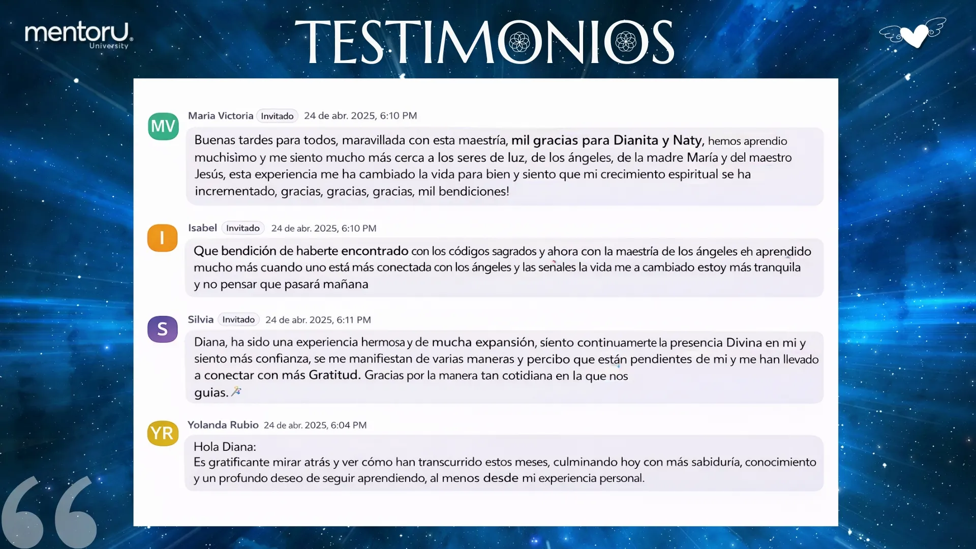 “Diana y su equipo me han llevado de la mano a conocer a los representantes de esta sutil energía de amor, para mantenernos en la más alta frecuencia de luz. Más que hacer la maestría, la invitación es a vivirla, semana a semana, logrando así una conexión genuina y única con nuestro ángel de la guarda y con todos los demás seres de la corte angelical que están a nuestro servicio. Estoy muy agradecida por haber tomado acción y haberme dado la oportunidad de inscribirme a la Maestría”.