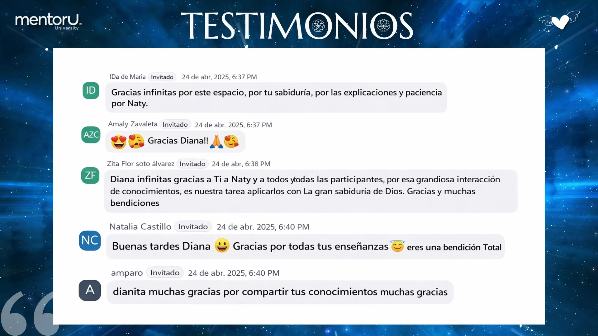 "Mi experiencia con los cursos sobre abundancia de Diana ha sido muy positiva. Yo tenía negocios que se vieron afectados por Pandemia y por la crisis, no acababan de funcionar, hasta que pensé: Diana dice que nos enfoquemos en lo que queremos conseguir, darlo por hecho y agradecerlo por anticipado, como si ya lo hubiese conseguido. Usé las herramientas aprendidas y para mi sorpresa, grandes noticias llegaron para mis negocios y mis ventas crecieron muchísimo. Agradezco infinitamente los cursos de MentorU y especialmente los de la Ley de la Abundancia. Agradezco a Diana y Carolina todo lo que nos enseñan y también a nuestra Super Naty. Recomiendo al 100% los cursos de MentorU.Gracias. Gracias. Gracias"