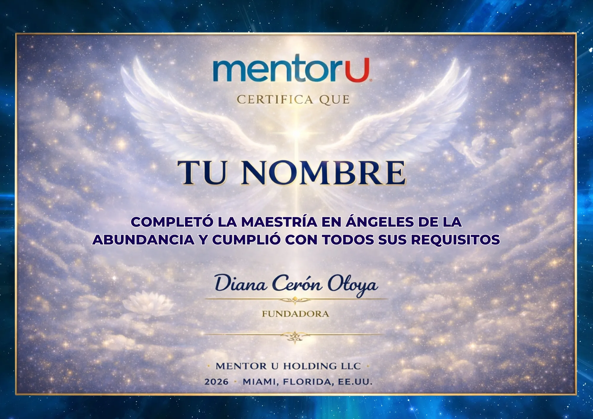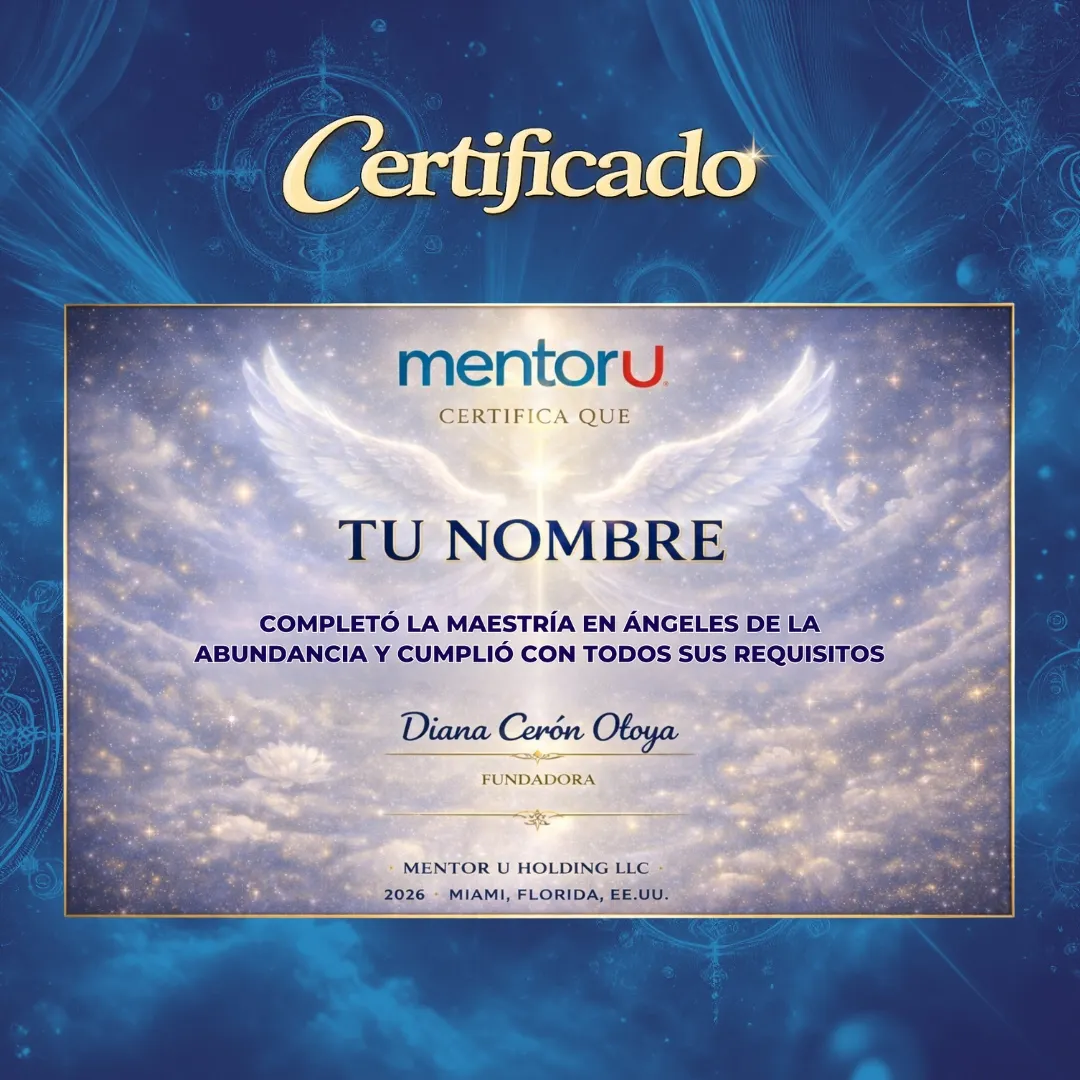 Al completar la maestría, recibirás un certificado oficial de Mentor U Holding que valida tu conocimiento en abundancia angelical. Más que un certificado — es un recordatorio tangible de tu compromiso, tu crecimiento y la nueva versión de ti mismo que has construido.